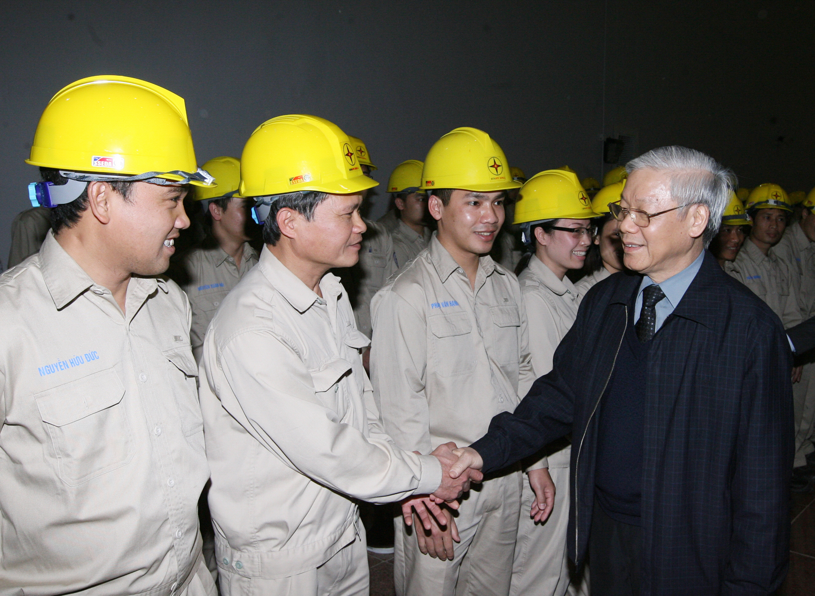 Tổng Bí thư Nguyễn Phú Trọng thăm hỏi cán bộ, công nhân viên Nhà máy Thủy điện Sơn La _Ảnh: TTXVN
